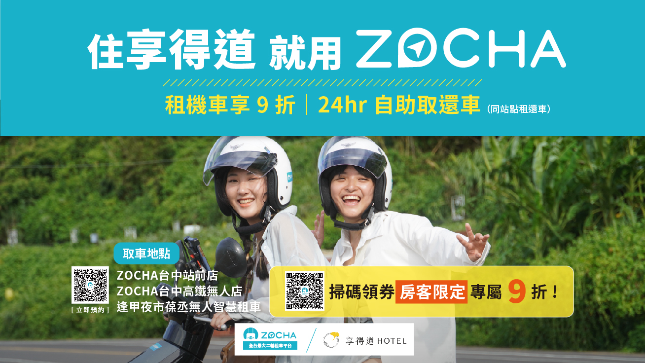 來台中旅遊,還在煩惱交通安排嗎?入住「享得道 HOTEL」,即可享有 ZOCHA 機車租賃 9 折優惠!